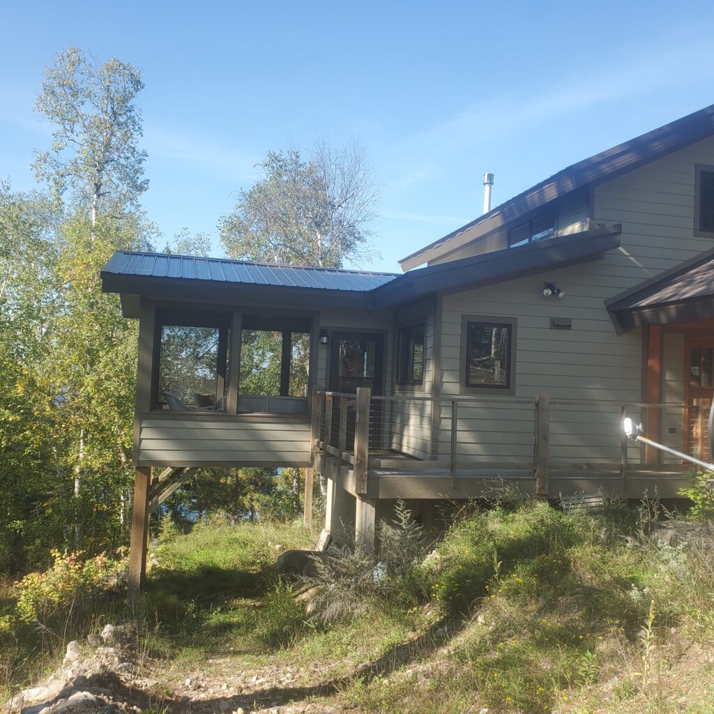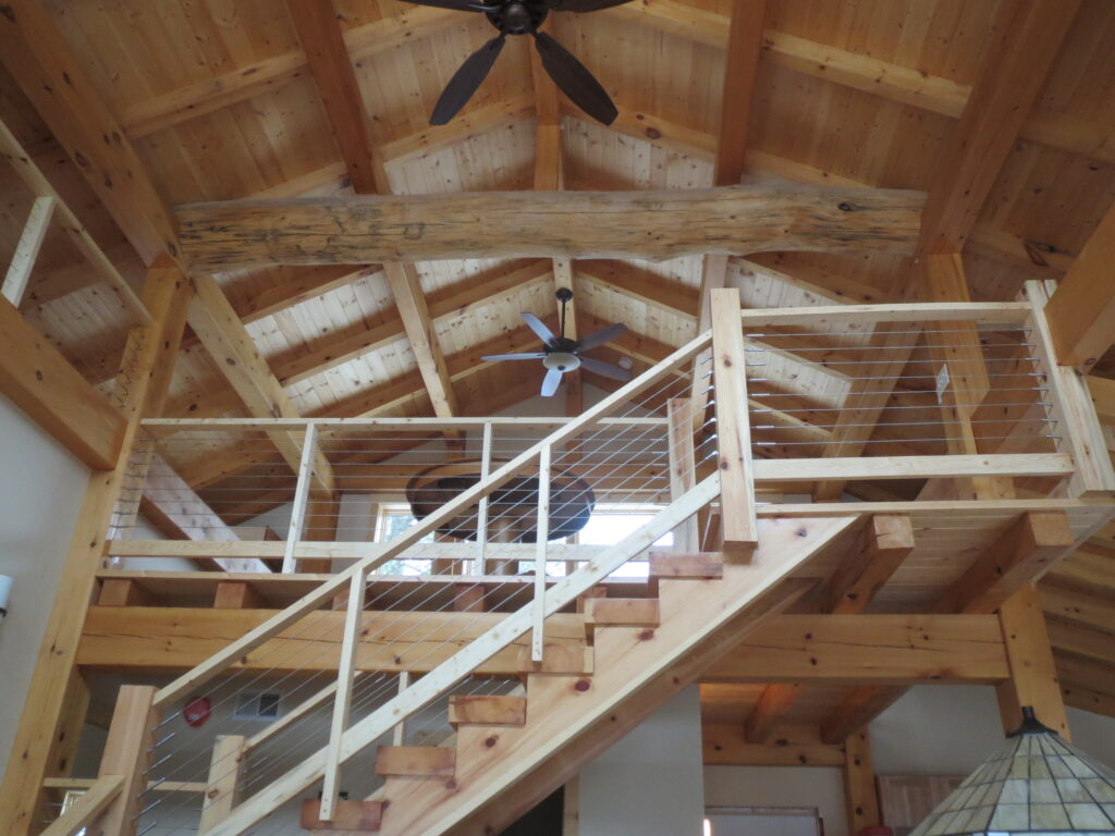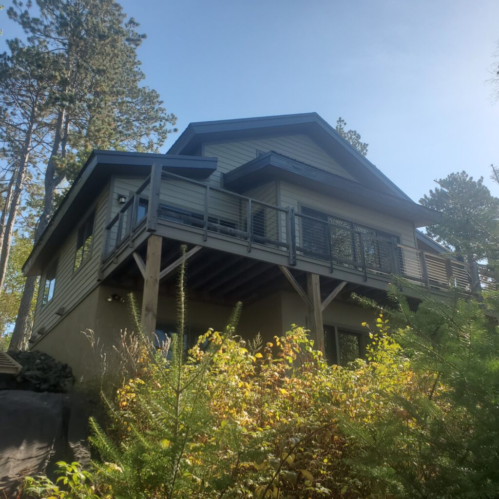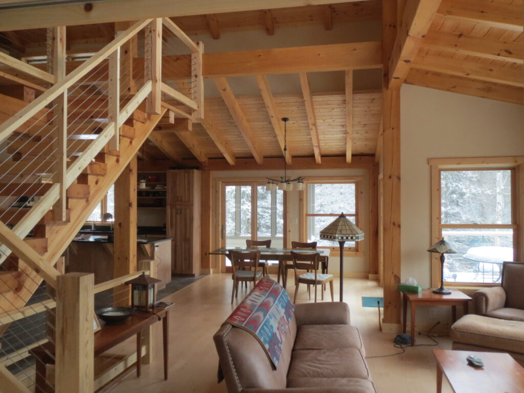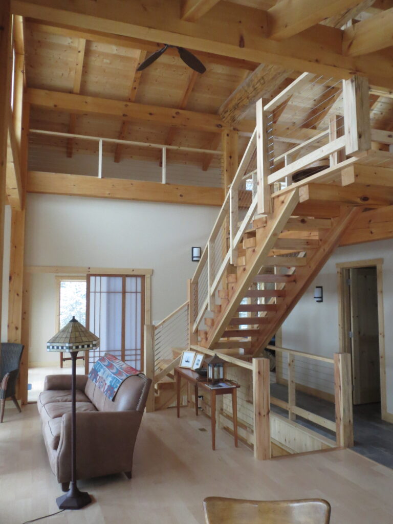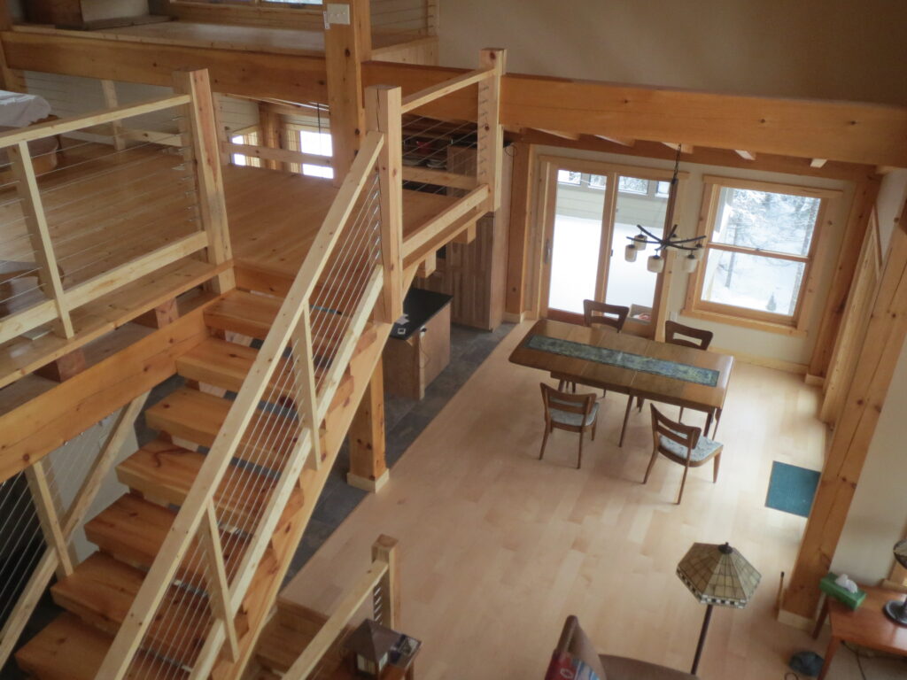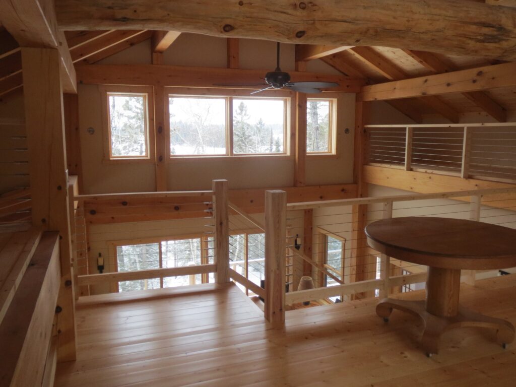 This is a simple timber frame lake home using pine timbers. The homeowners took a course at the North House Folk School in Grand Marais MN where they shaped all the timbers and then had a timber raising with friends to put it all together on site. We came in after that and finished some of the timber work and assembled the SIP panel shell and finished everything else including the timber stairs and railing with the stainless steel cable and all the other finish work, siding and steel roof. A fun project for sure.
