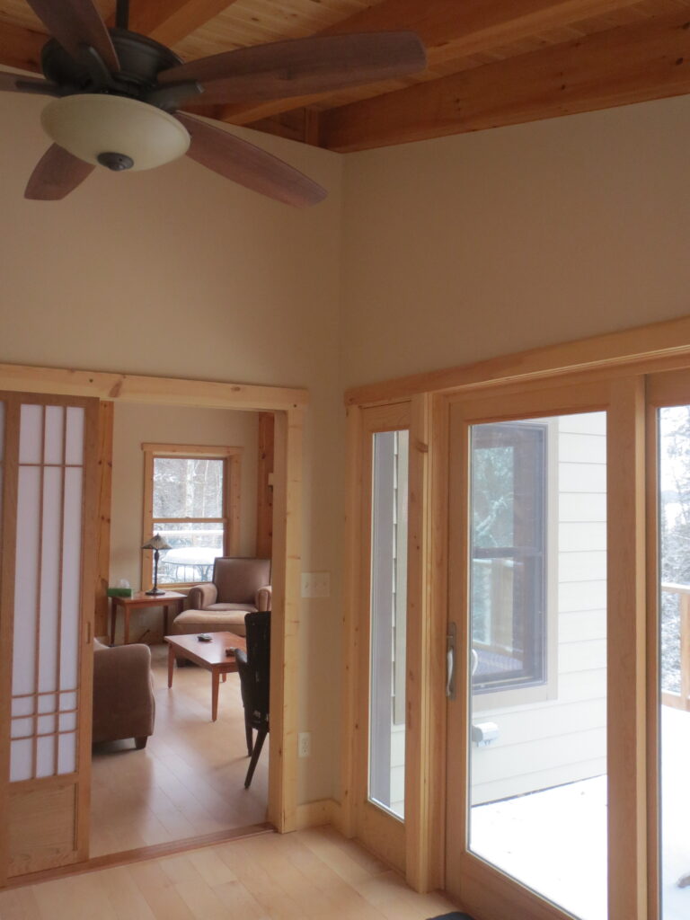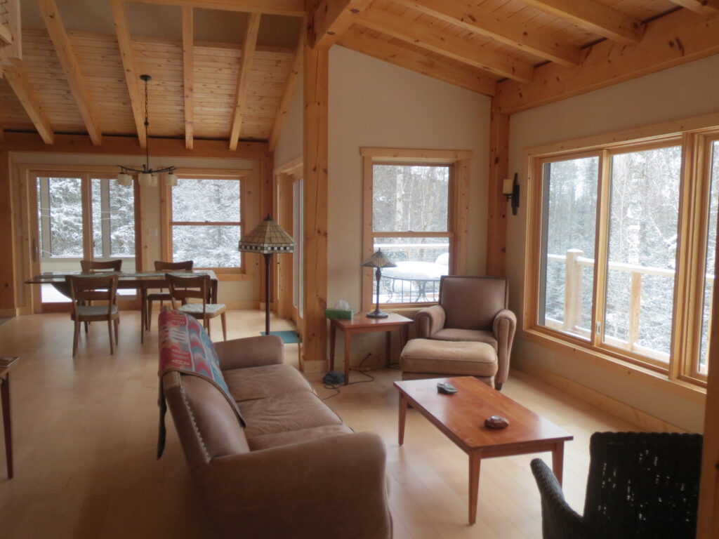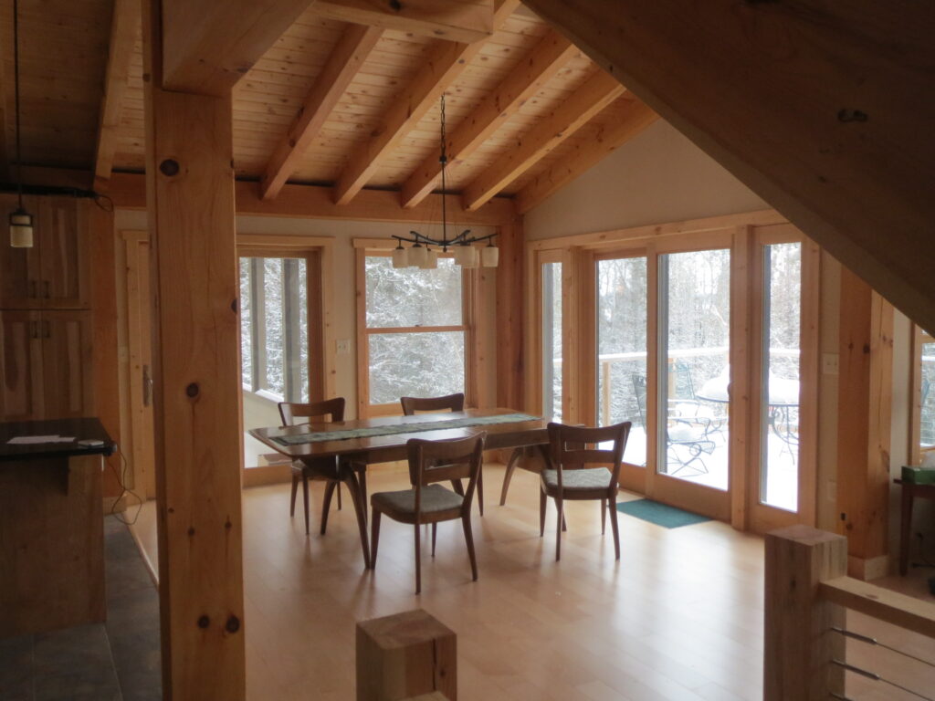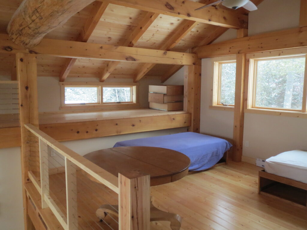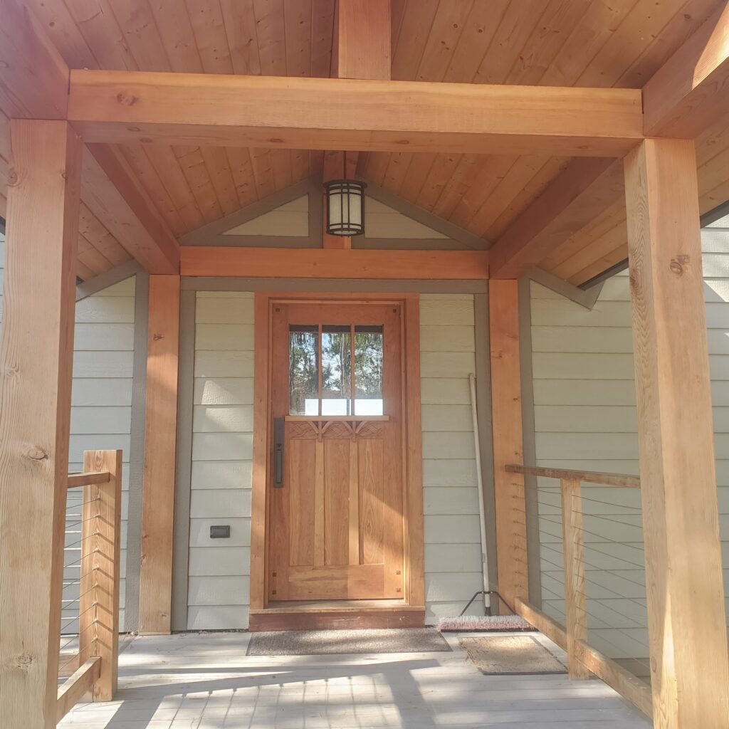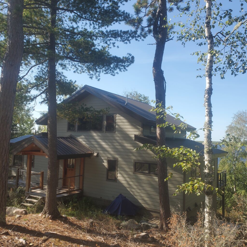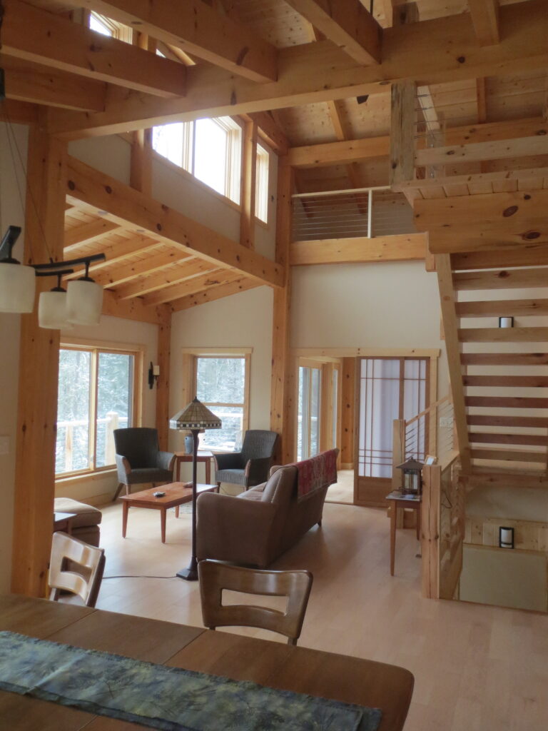 This is a simple timber frame lake home using pine timbers. The homeowners took a course at the North House Folk School in Grand Marais MN where they shaped all the timbers and then had a timber raising with friends to put it all together on site. We came in after that and finished some of the timber work and assembled the SIP panel shell and finished everything else including the timber stairs and railing with the stainless steel cable and all the other finish work, siding and steel roof. A fun project for sure.