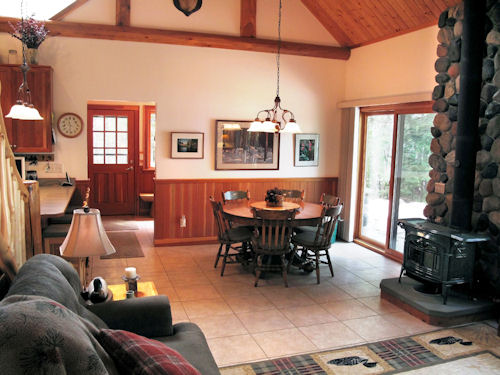 Cedar and stone lake cabin, entry Living room stone douglas fir & cedar logs living room woodstove stone chimney dining area douglas fir stone ceramic tile floor bedroom drywall douglas fir bedroom with drywall doug fir cedar logs Looking up at the loft area from living room Looking up at the loft area from living room Looking up at the loft area from living room Looking over living room from the loft Little nook sitting area in loft Exterior from lake, stone landscaping Exterior from lake, stone landscaping Entry Area, Douglas Fir wainscotting Kitchen, Cherry Cabinets