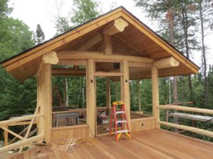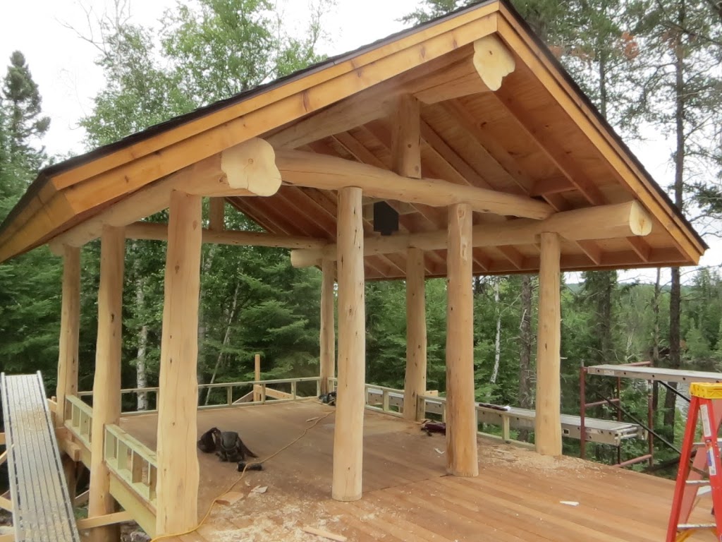 And here is a shot from pretty much the same position on the of the new deck and the log supports and roof in place. We took off the old cedar decking and re-framed the deck extending it out to flow right into the screen house. The new decking is Ipe. (More info on Ipe here).