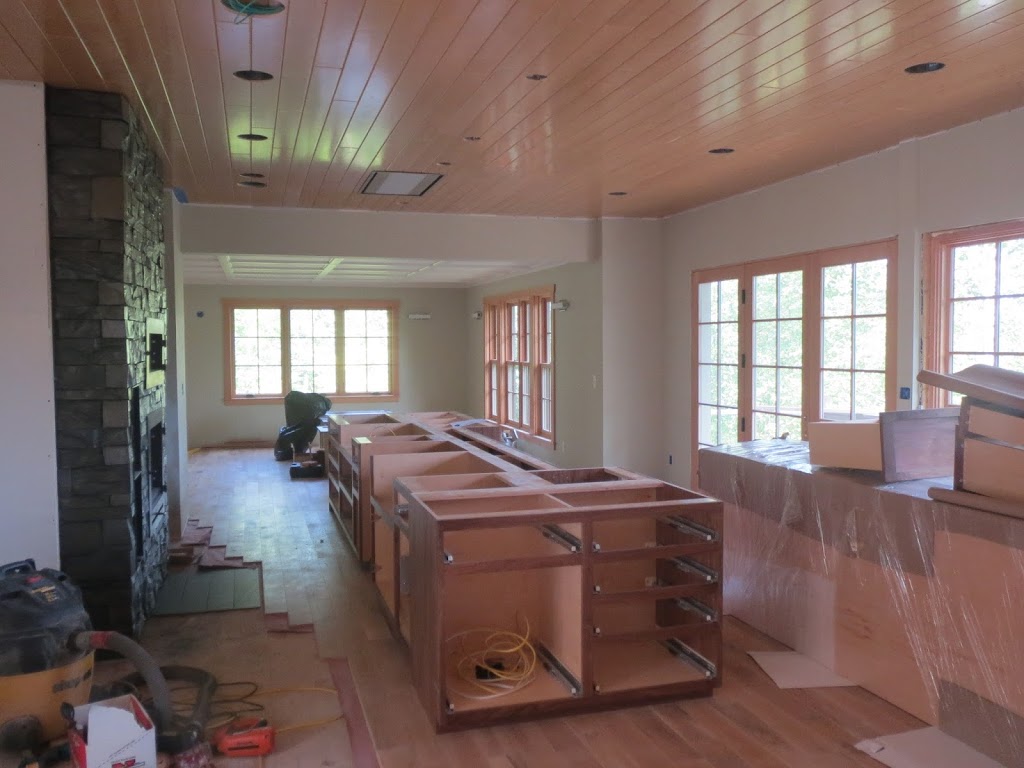 Looking through the kitchen area to the living room.  Waiting for some granite counter-tops and appliances to finish off the cabinet area. A coat of sealer on the stone pizza oven on the left really deepens the color of the rock.